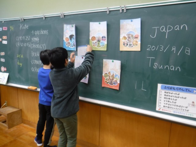 まず、黒板に貼ってある様々な国のポスターから、行ってみたい国とそこで何をしたいかを選びます。
