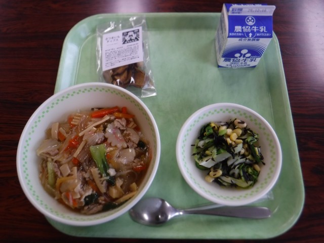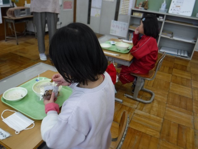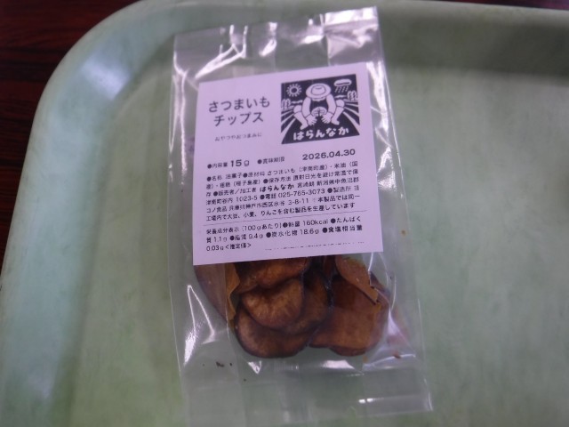 献立の中のお米とにんじんと大豆、さつまいもチップスが有機食品でした。