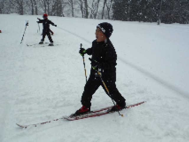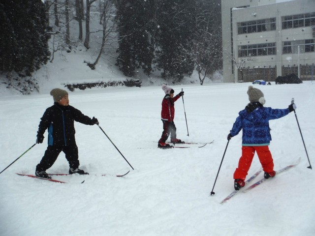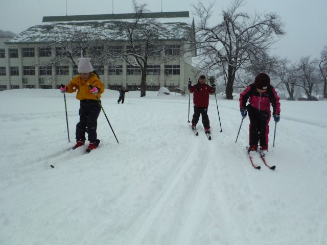グラウンドに雪が積もり、スキーが始まりました。