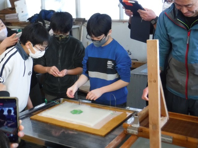 棒でよくかき混ぜて、紙すきの板を入れてすいていきます。