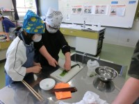 初めてミシンを扱う5年生が、下糸の出し方に苦労していました。何度も練習しコツが分かると、にっこり笑顔が増えました。