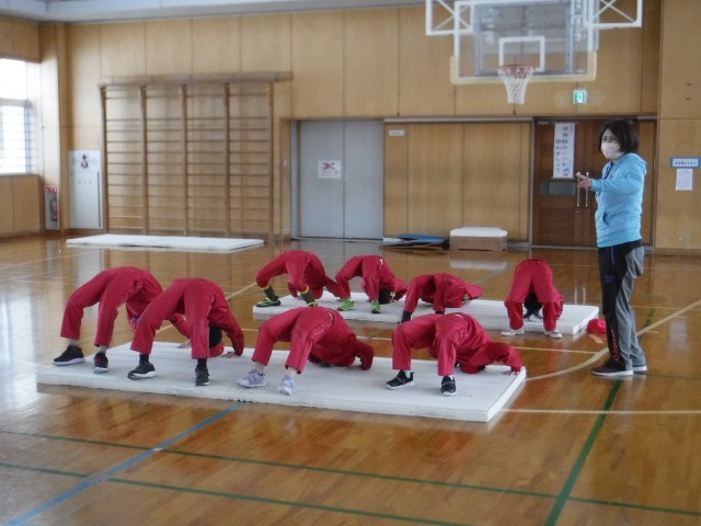 1.2年生が体育館で、マット運動をしていました。まだ、マット運動の学習を始めたば...