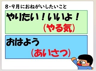 校長の話では、「8・9月にお願いしたいこと」として「やる気」「あいさつ」を大事にしてほしいと伝えました。