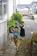 休み時間になると、全校が集まってきました。全校でスイカ割り。小規模校ならではの光景ですね。ありがたいです。