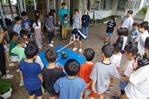 せっかくなので、「スイカ割りをしよう」ということとなり、最初は1年生を招いて、スイカ割りをスタート。なかなか割れません。