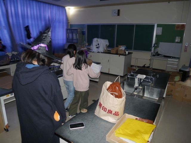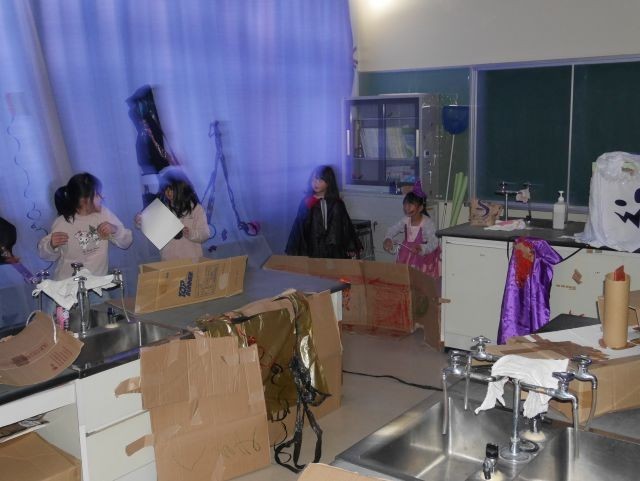 1・2年生が自分たちのクラスの企画で、おばけやしきを開きました。1・2年生に限ったことはないですが、子どもたちはみんな「おどかされる」のは嫌いなのに「おどかす」のは大好きです(笑)。3年生以上の子どもたちと先生方がお客さんですが、(しょせん1・2年生のつくるものだから)とナメてかかると意外に怖かったようで、素敵な叫び声が廊下に響いていました。