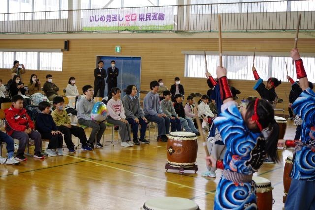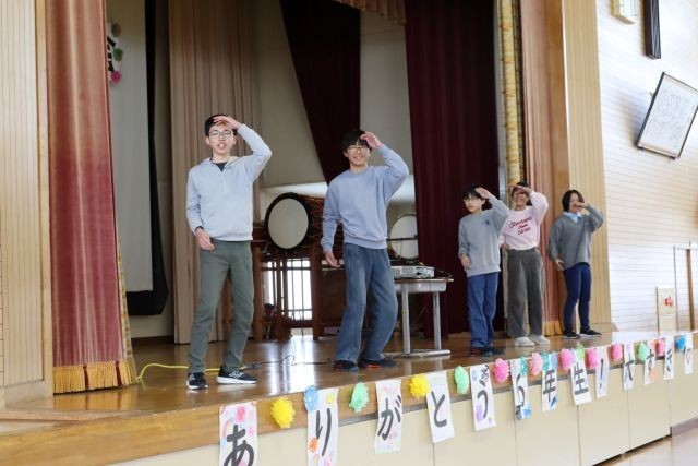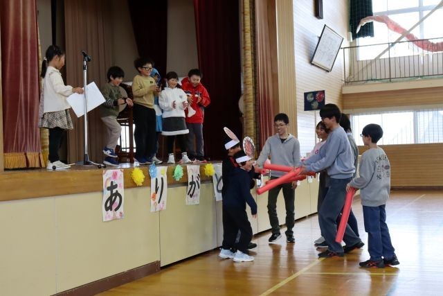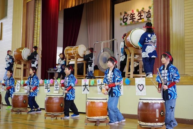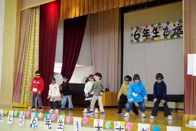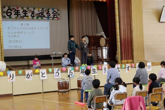 児童会行事「6年生を送る会」を開催しました。今まで全校のことを考え、リーダーシップを発揮してきた6年生に感謝の気持ちを伝えようと、5年生が中心となって企画・運営を頑張りました。全校児童33名は、普段から学年を超えて様々な場面でつながりかかわり、家族のような存在です。同じ校舎で過ごす時間はあとわずかですが、楽しい思い出にしてもらおうと、各学年が発表やメッセージで思いを込めていました。またこの日は、3年生が加わった新編成での龍神太鼓の初披露の場でもありました。これまでの練習で聞こえてくる音はなかなかそろわず心配していましたが、この日はこれまでで一番の出来栄えでした。6年生も安心してバトンを渡せると思ったことでしょう。こんな関係性から6年生がもうすぐ抜けてしまうことの実感を、5年生以下だけでなく6年生自身もまだもてていない様子でしたが、心温まるひとときでした。