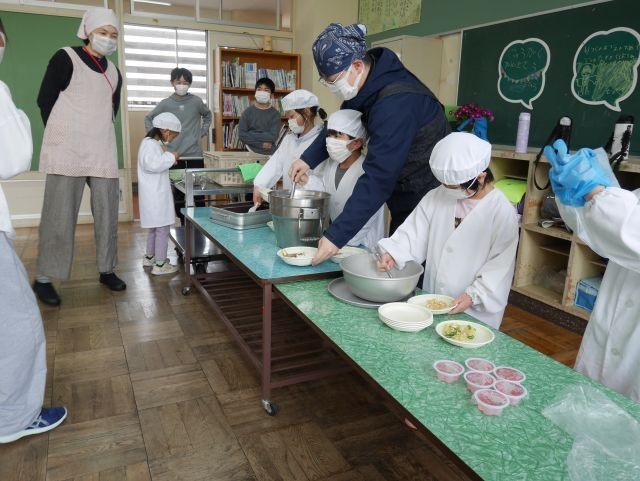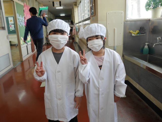 入学5日目にして、1年生の給食が始まりました。初めてのメニューは「コロコロ野菜カレーライス」「大豆とツナのサラダ」「さくらゼリー」「牛乳」です。2人の1年生は、授業はもちろん、給食もとっても楽しみにしていた様子。おなかもペコペコ。当番も、1・2年生合わせて5人しかいないので、毎日5人全員が当番になり、順番に席に運びます。もちろん、順番待ちの行列もなし。6年生の「見守り隊」も出番はないくらい、支度も食べっぷりもりっぱでした。これからも楽しみです。