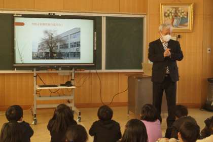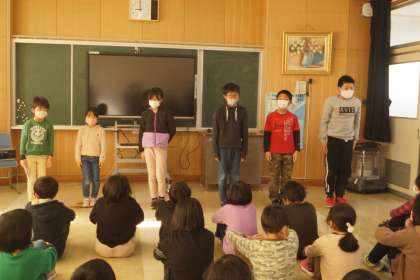 各学年の代表が後期を振り返って発表を行い、校長先生から1年間を振り返るスライドを見ながら子ども達の頑張りや成長について褒めていただきました。