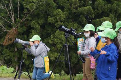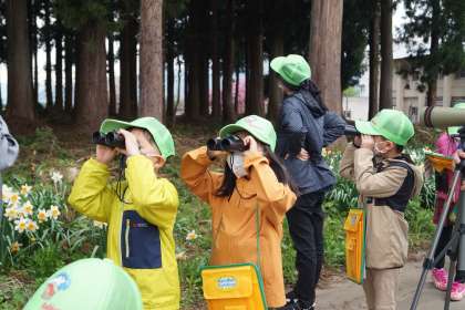 子どもたちは縦割り班ごとになり、指導者の案内で学校周辺をまわり、双眼鏡やフィールドスコープをのぞき込みながら野鳥の姿を観察したり、耳を澄ませて鳴き声を聞いたりしました。