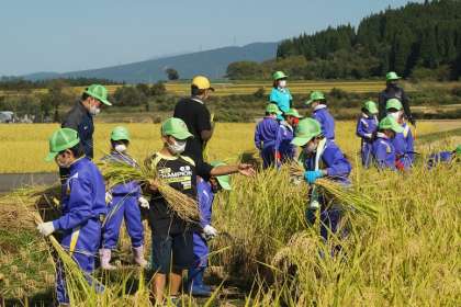 5月、借用田に植えた苗が黄金色の稲穂を実らせ、10月4日(月)に全校で稲刈りを行いました。