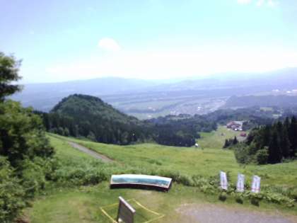 空のてん望台は、マウンテンパーク津南スキー場の上にあります。遠くには、苗場山や鳥甲山のすがたを、正面に見える沖ノ原台地には、流れ留まった苗場山の溶岩の起伏をかくにんすることができます。