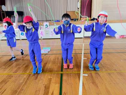 3・4年生を対象に、基礎的な回し方からみんなで楽しめるなわとび遊びまで、幅広く指導していただきました。二重とびは、なわを持たなくて、ジャンプしている間に手を2回たたいてタイミングをとる練習などでとべるようになることを教わりました。子どもたちは、何回か練習をしているうちに、連続で二重とびができるようになってきました。
