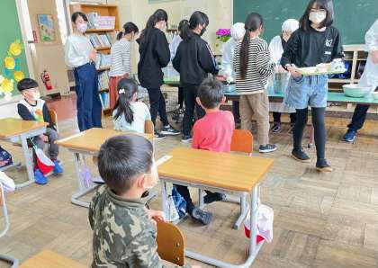 今日は、5・6年生が、給食の準備、片付けに来てくれました。しばらくやり方を覚えるまではお手伝いにきます。ゆくゆくは、1年生だけで給食の準備ができるようにしていきます。