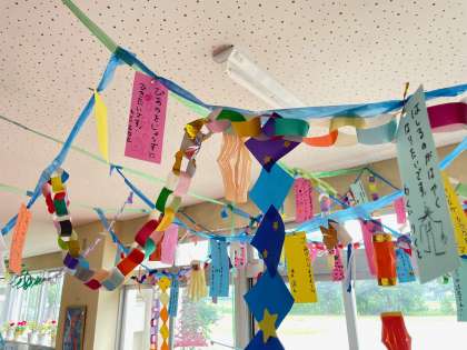 集会では、七夕にまつわる話をクイズ形式で聞いたり、じゃんけん列車で天の川のようになったりしました。絵合わせゲームで、友達づくりも行いました。みんなが楽しく、仲良くなれた日でした。その姿は、織姫と彦星のようでした。