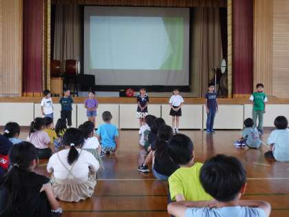 7月4日(火)七夕の日まで少し早いのですが、保育園児と小学生で七夕集会を行いました。総務委員会が中心になって会を進行し、楽しく過ごすことができました。この日は、わかば保育園の年長さんを招待し、一緒に楽しみました。