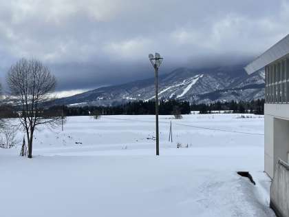 12月20日(水)、天気が少し回復し校舎から山々がきれいに見えました。とがった山が山伏山です。また、校舎から見えるスキー場は、さかえ倶楽部スキー場です。滑るコースだけに雪があり、ゲレンデがよく見えます。今週末から大雪予想です。十分に気を付けてください。