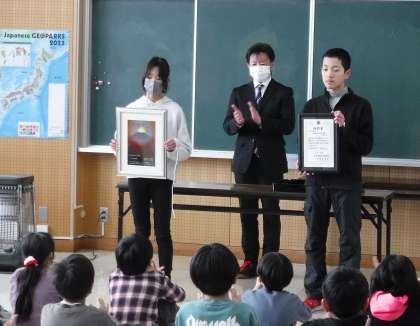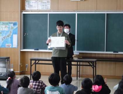 12月22日(金)冬休み前の全校集会を行いました。先だって、直近の表彰を行いました。町のユニバーサルホッケー大会2位、米・食味分析鑑定コンクール国際大会inつなん特別賞、親善剣道大会2位の表彰など子どもたちの活躍が目立った後期前半の活動でした。