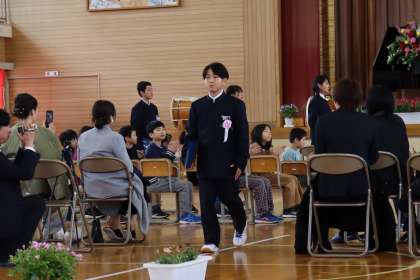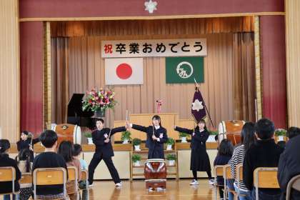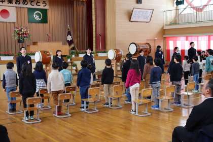 卒業生から在校生に龍神太鼓の演奏をプレゼントしました。芦ヶ崎小学校の伝統の卒業式イベントです。最後には、晴れやかな顔で卒業生が退場していきました。中学生になっても自分らしさを出して、さらにステップアップしていってください。