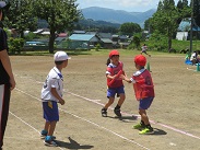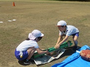 下学年種目「運ぼう!津南のおいしいもん♪」では、津南町のおいしいものを2人で協力して運びます。大きいもの、小さいもの。どちらが運びやすいのかな?