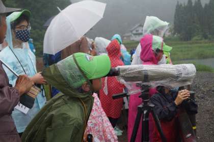 あいにくの雨模様でしたが、学校周辺〜龍ヶ窪、田んぼ周辺を回り、野鳥の声に耳を澄ませたり、木立の上や人家の屋根、電線にとまる野鳥の姿を観察したりしました。