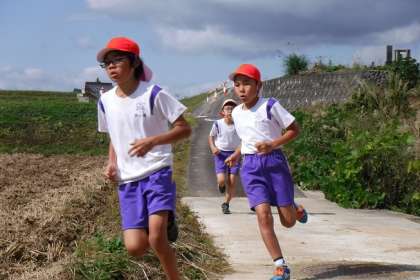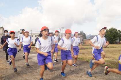 田んぼのあぜ道コース1.3kmを、低学年が1周、中学年は2周、高学年は3周走ります。