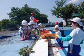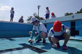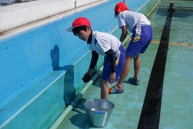 ようやく芦ケ崎の地も、暑い日が続くようになりました。夏のプール学習に向けて、3〜6年生でプール清掃を行いました。プールの底面はぬるぬる。オタマジャクシやヤゴもたくさん。滑らないように、転ばないようにしながら、デッキブラシを使って、少しずつ底面をきれいにしていきました。