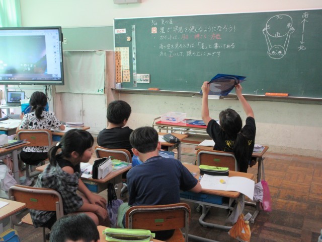 4年生は、Ⅰ期にドーム中里「き・ら・ら」でのプラネタリウムでの学習を行っています。この日は、星座早見の使い方の学習でした。持ち方や包囲、月日、時刻の合わせ方など、細かな手順がなかなか大変のようですが、ペアで協力しながら学んでいました。