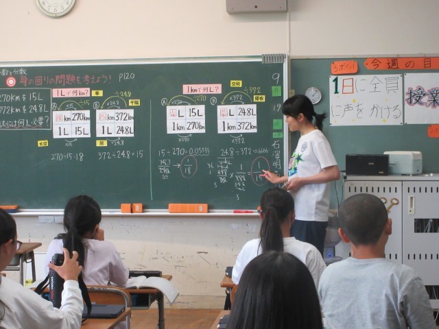 学級を担当する全ての職員が授業研修に取り組んでいます。今回はその3回目6年2組で算数の指導について研修しました。子どもたちは、分数を使うと割り切れない計算ができ、日常の場面でも利用できることを学んでいました。今後、この授業を受けて6年1組で授業を行います。全学年で国語と算数の2教科でこのような授業研修を行います。子どもたちにより良い授業が提供できるように頑張ります。