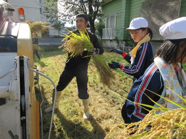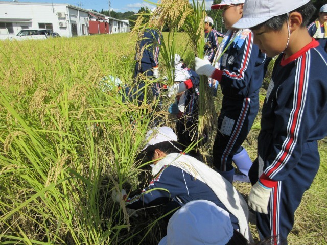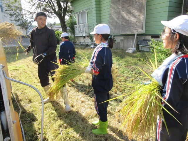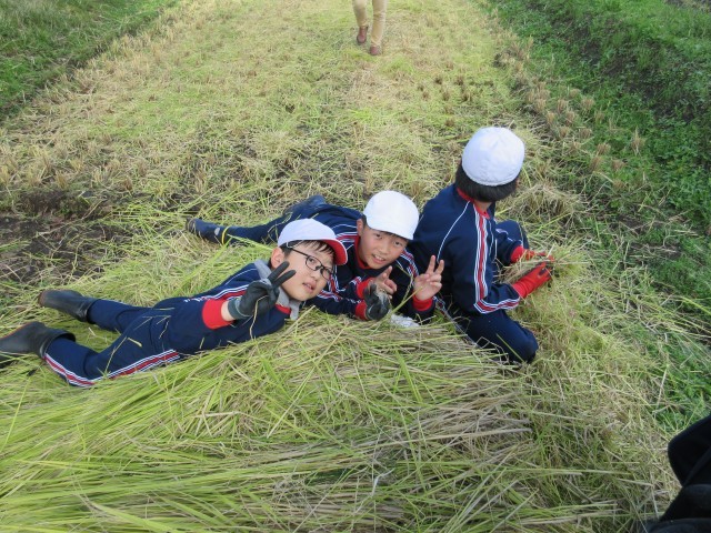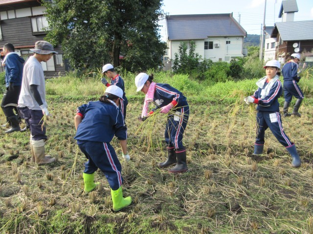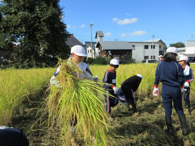 多くのボランティアの皆様から教えていただきながら、稲を刈りました。最初は慣れない手つきでしたが、徐々に上手になり、手際よく刈れるようになりました。みんなの頑張りが刈り取られた田んぼの広さに表れていました。全て刈り取った後に落ち穂拾いも行いました。今回の稲刈りを通してお米の大切さを更に深く学ぶことができました。