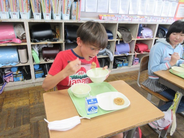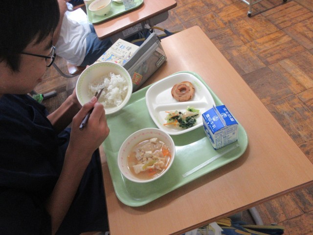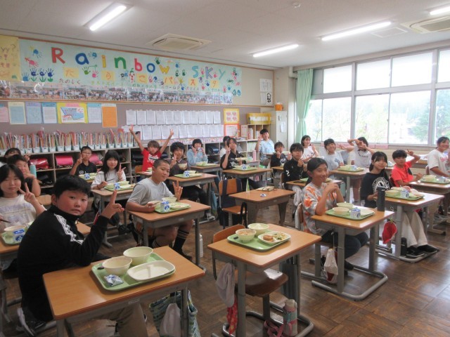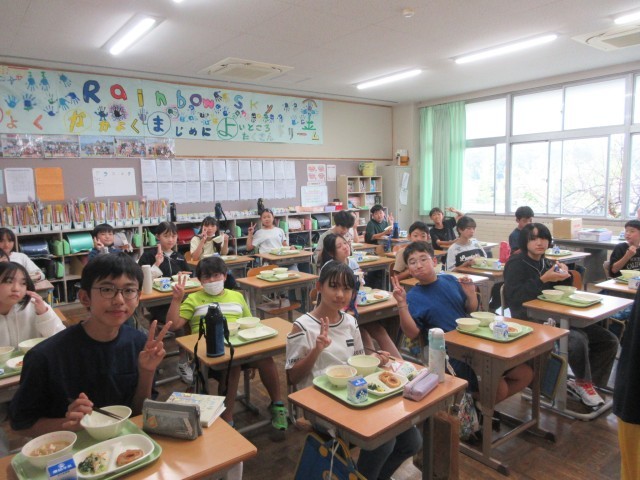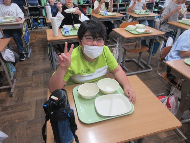 本日のメニューは、ご飯、牛乳、車麩の揚げ煮、五色和え、つぶつぶ大豆の呉汁でした。車麩は甘辛く味付けされていて美味しかったです。呉汁は具だくさんで大豆のうまみも感じられ美味しかったです。6年生の両クラスとも、にこやかに食事を楽しんでいました。