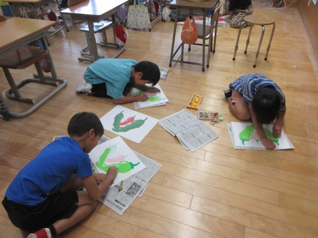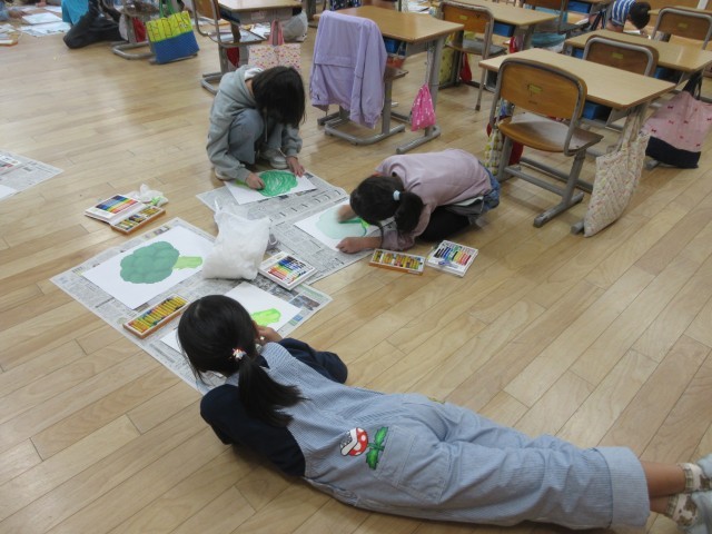 2年生は床に伏せったり正座したりして、必死にお絵かきしていました。何か作ってるの?「秘密!」・・・素敵なお野菜の絵が描けていました。