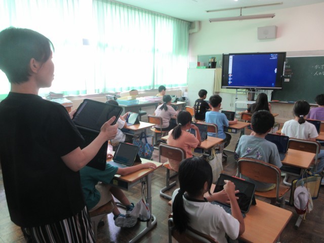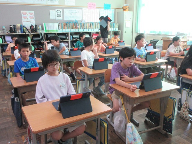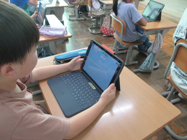 3年生が、新しい端末の使い方やアプリの使い方を学んでいました。先生の説明にしたがってスイスイと操作を進める子どもたちに驚きました。