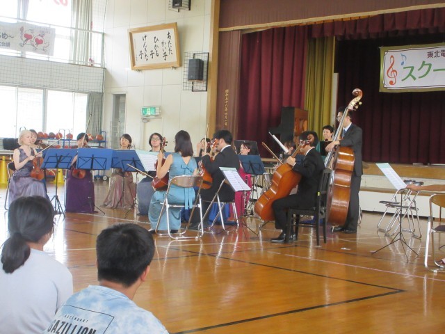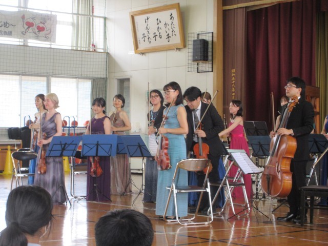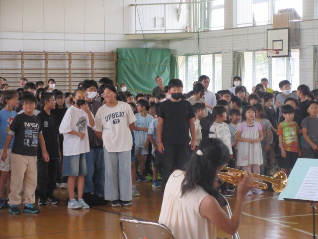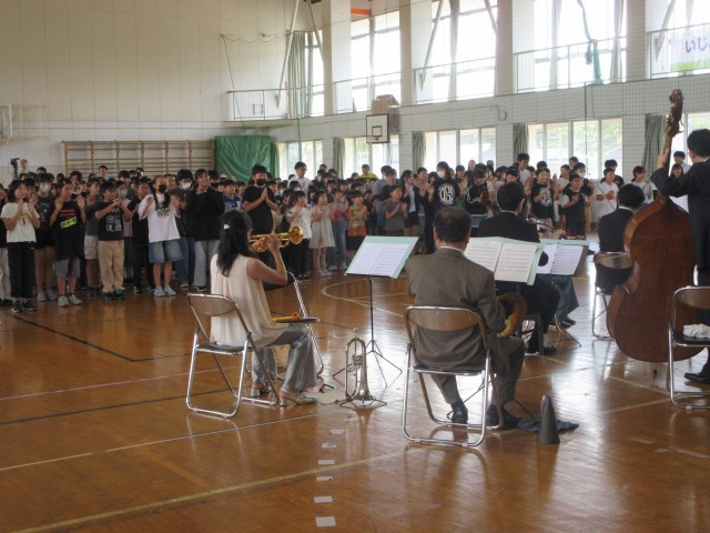 新潟アルスノーヴァの17名の方々が子どもたちになじみのあるクラシックやアニメのテーマソングなど全8曲を演奏してくださいました。各楽器紹介の場面、演奏曲に合わせて子どもたちが体を動かす場面、みんなで歌う場面など、様々な工夫を凝らしたコンサートに魅了されました。