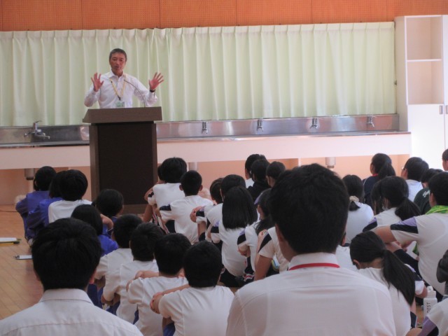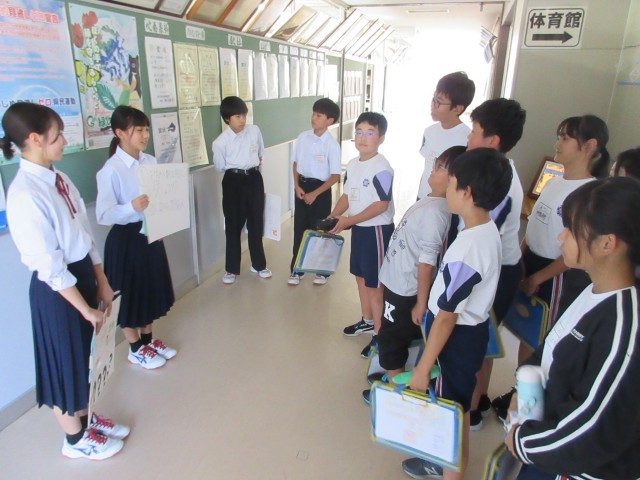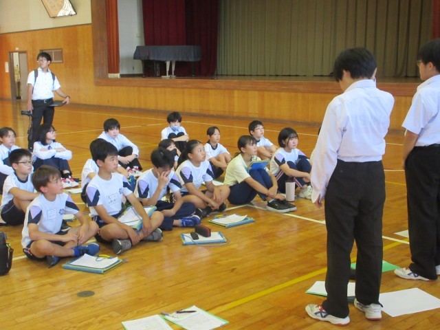 全員に向けて校長先生からお話があった後、班に分かれて体育館へ、中学生から学校生活の説明を聞いたり、校内を案内してもらったりしました。