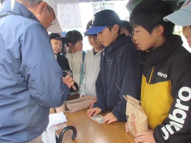 11月3日 軽トラ市で5年生が育てたお米「きぼう米」を販売しました。