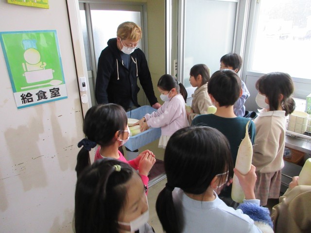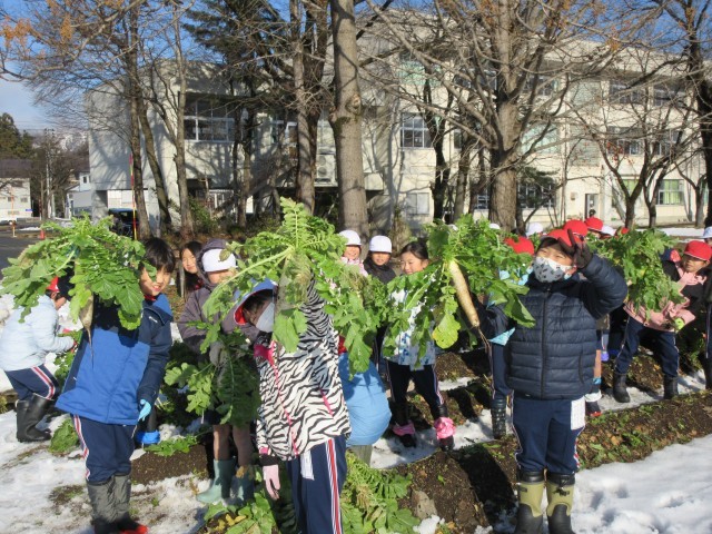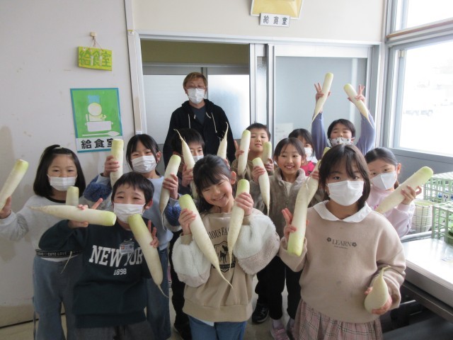 じつは収穫は今回が2回目。1回目の収穫では大量の大根を収穫し、その日の給食に使ってもらうため、調理員さんへお届けしました。全校の味噌おでんの中に入った2年生の大根は、いつもの給食をより一層美味しくしていました。