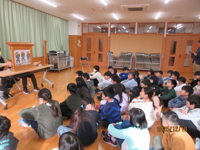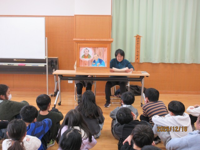 地域コーディネイターをお迎えし、佐藤佐平治の偉業について紙芝居を通して学びました。