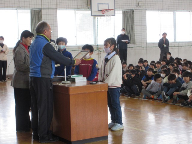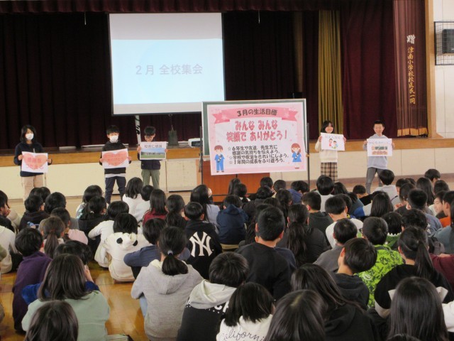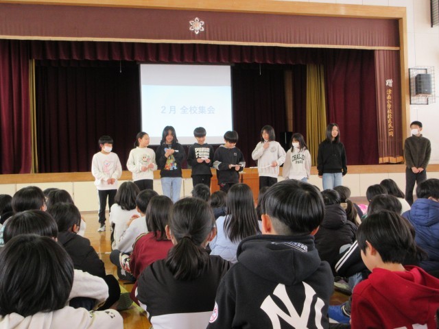2月16日 全校集会を行いました。校長からは現在繰り広げられている冬季オリンピックの競技、カーリングの「コンシード」を取り上げ、カーリングのフェアプレイの精神を学校生活の中で生かしていこうと投げかけました。その後、スキー大会や作文コンクール等の表彰、3月の生活目標「みんな笑顔でありがとう。」についてのお話を聞きました。最後に5年生から、六送会の準備協力について全校に呼びかけ、6年生の思い出になる会にしようと全校で確認しました。