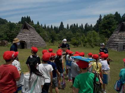 6月11日、3年生「たいよう」学年のはばたき学習で、「なじょもん」を見学に行きました。苗場山麓ジオパークのジオラマから津南町の地形の様子や特徴などを、また、縄文時代の暮らしについて、土器や竪穴式住居をもとに教えていただきました。今日の見学で興味や関心が高まってきたようです。これからの活動が楽しみです。