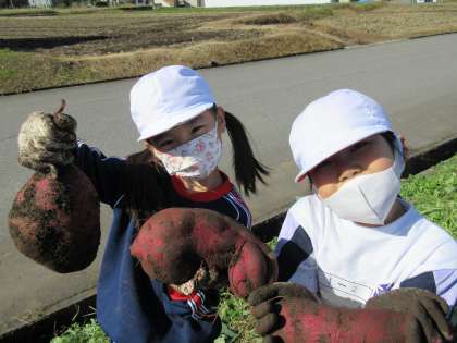 前の話題になりますが、1年生が育てていたさつまいもが、大きくなりました。この日は、みんなでいもほりをしました。とっても大きなさつまいもがとれました。