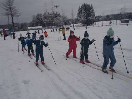 1年生は、今日、グラウンドでのスキー授業にデビューしました。先週、6年生に教わり、スキーのはき方も上手な子どもが多かったようです。心配していた子どもたちの手助けに、ボランティアの皆さんも駆けつけてくれました。1年生は、みんなが楽しく滑りました。