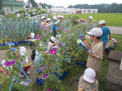 あさがおの花がたくさん咲き始めました。みんなで観察しました。夏休みは、家に持ち帰ってお世話をします。いくつ、お花が咲くかな?