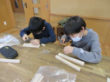 4年2組でも、のこぎりや金づちなどを使って、板を切り、自分の作りたい物を製作しています。初めて使ったのこぎりも、ずいぶん上手になりました。仕上げの組み立てや着色も始まりました。