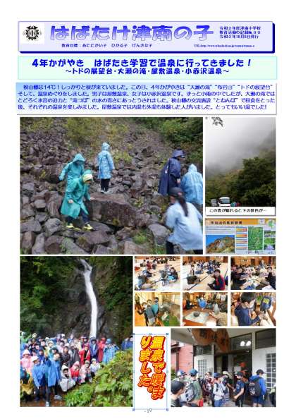 4年かがやきの皆さんがジオサイト見学&温泉に行ってきました。小雨交じりの天気でしたが、大瀬の滝や布岩山を見学してから、三密を避けるために小赤沢温泉と屋敷温泉に分かれて源泉掛け流し温泉のよさを味わってきました。苗場山麓ジオパークに散在する数々のたからものを知ることで、故郷への思いを強めることのできた学習でした。