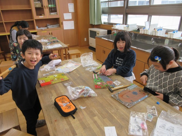はじめてのくぎ打ち体験です。ビー玉を飛ばして、くぎのピンに当たってあちらこちらに転がるコリントゲームを作っています。楽しいゲームになるよう、くぎ打ちを楽しんでいます。