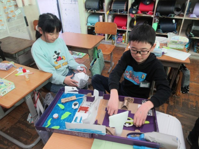磁石の学習のまとめは、磁石の性質を使ったおもちゃ作りです。引き付け合ったり、反発し合ったりする性質などを利用し、いろいろ工夫したようです。この時間は、それぞれ交代しながら遊びあう時間で楽しそうですね。