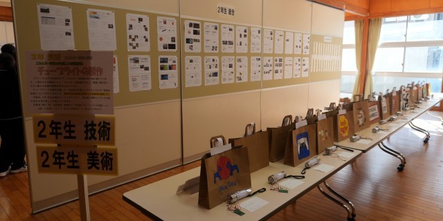 美術や技術・家庭科での作品のほか、総合的な学習の時間のレポート、国語の短歌も展示され、保護者の方だけでなく生徒たちも同学年の仲間や他学年の作品を鑑賞しました。