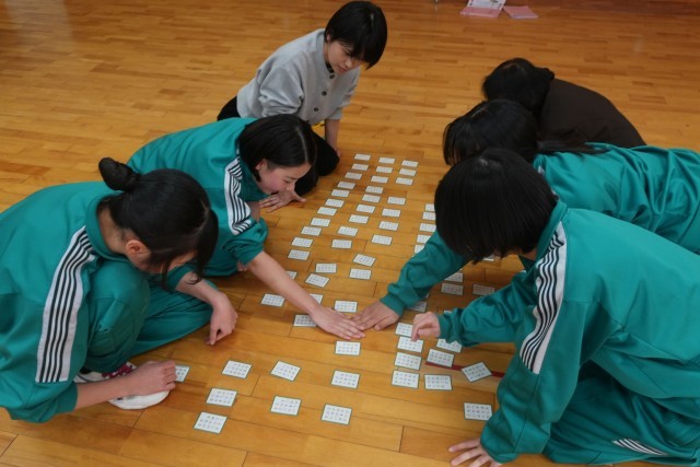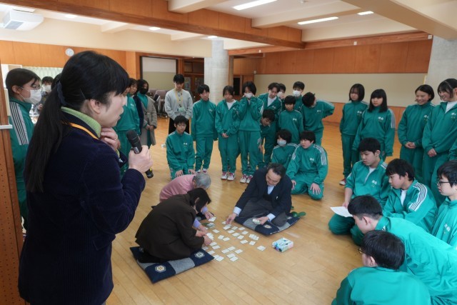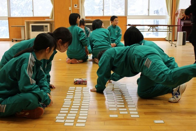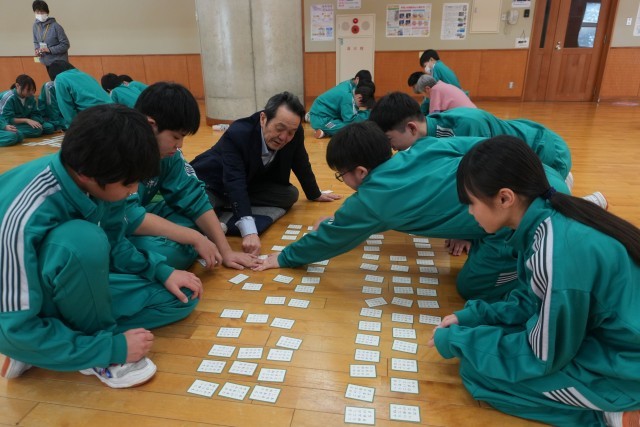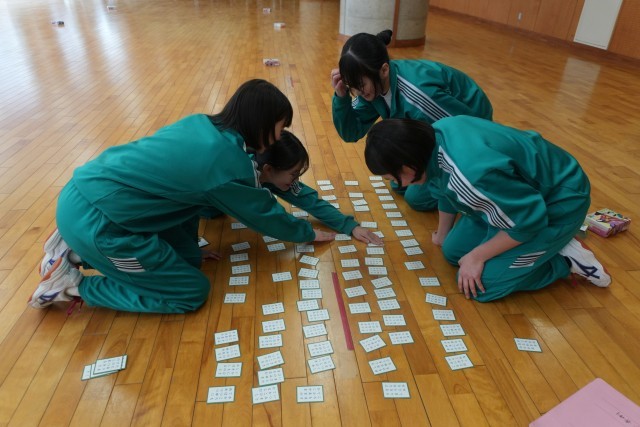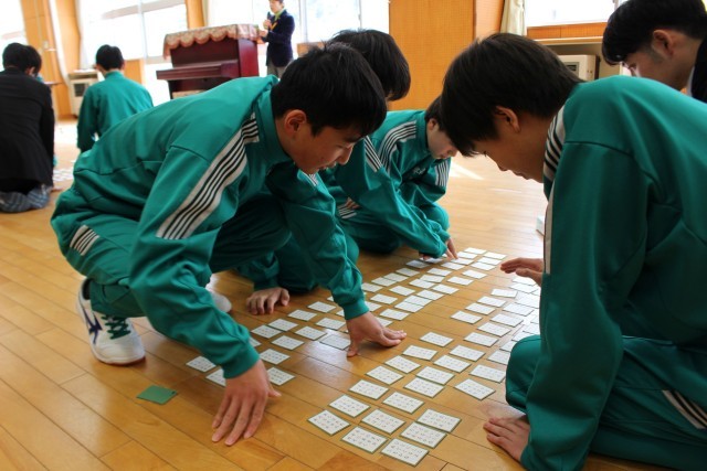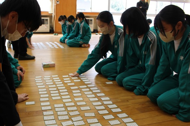 対戦は源平合戦(チーム戦)方式で、学年部職員も生徒に混ざって参加しました。生徒たちは、冬休みに各自が覚えた「得意札」が詠まれると、素早く反応して札を取りに動き、どの学年も学習の成果が感じられました。