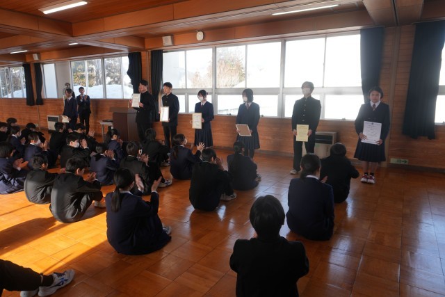 2月24日(火)、3年生にとっては最後の全校朝会で、スキー大会や越後妻有雪ん子造形展などの各種賞状伝達を行いました。